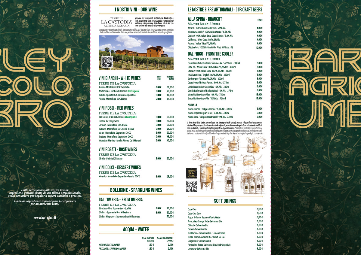 L'idea di questo locale nasce da Marco Farchioni, dalle sue radici e dalla sua natura da sognatore, in continuo fermento. L'anima agricola umbra di Marco si è evoluta in Barley Agricolo Umbro, un luogo che non ama essere definito, ma dove assaporare un'insolita Umbria.